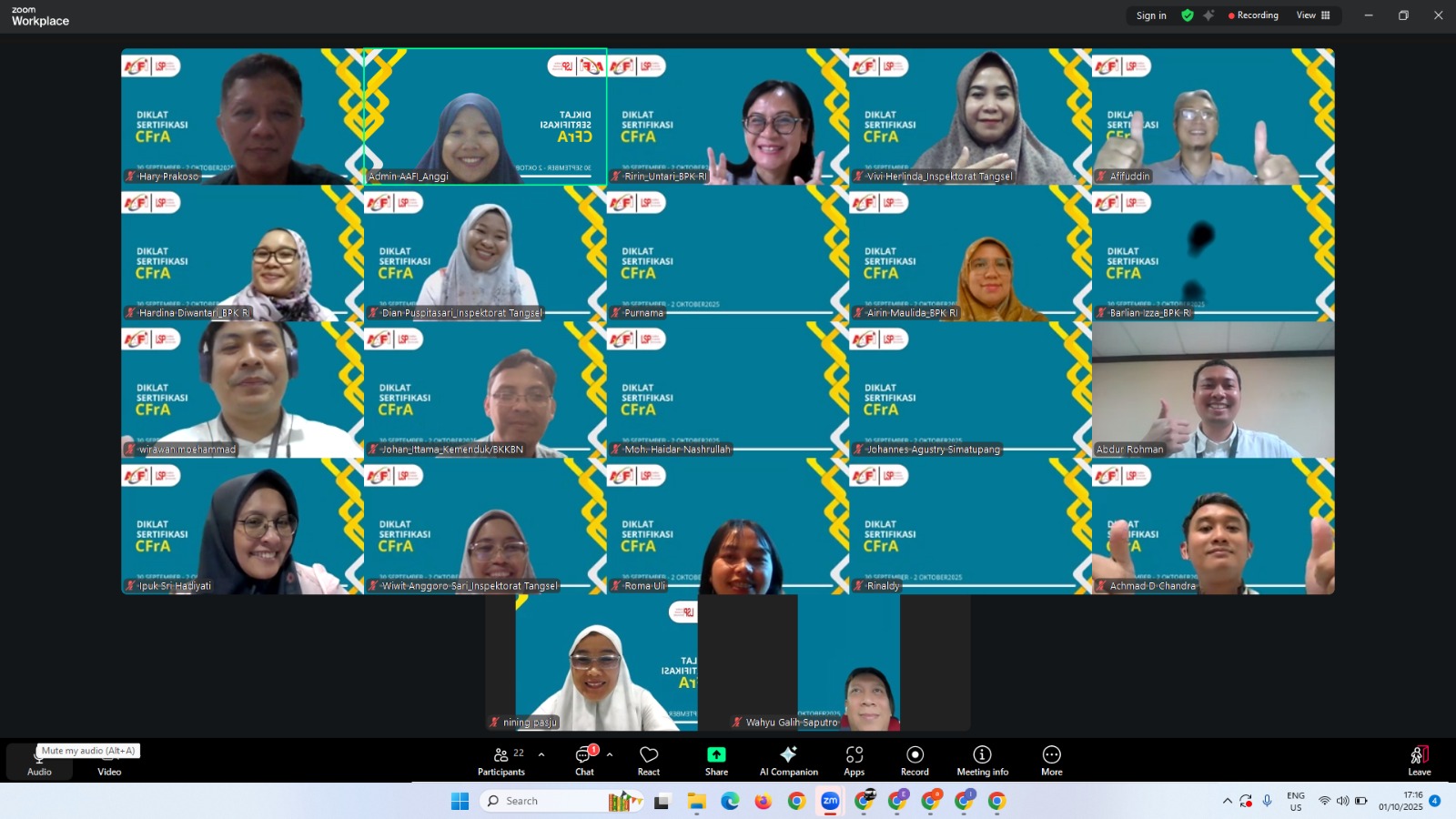 Diklat CFrA ini membekali para peserta—yang terdiri dari auditor internal pemerintah, akuntan publik, hingga aparat penegak hukum—dengan pemahaman mendalam mengenai teknik investigasi, akuntansi forensik, hukum pembuktian, dan analisis data digital. Materi disampaikan langsung oleh instruktur yang merupakan pakar forensik nasional. Proses sertifikasi diakhiri dengan ujian yang ketat untuk menguji penguasaan materi dan kemampuan analitis peserta dalam menangani kasus-kasus kecurangan kompleks. Tingginya standar ujian memastikan bahwa pemegang gelar CFrA adalah profesional yang benar-benar siap diterjunkan ke lapangan.